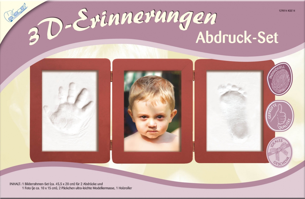 Inhalt: 1 Bilderrahmen-Set (ca. 45,5 x 20 cm) für 2 Abdrücke und 1 Foto (je ca. 11 x 16 cm), 2 Päckchen Modelliermasse, 1 Holzroller