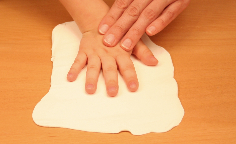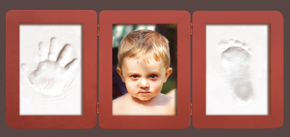 In diesem Set können 2 Abdrücke und 1 Foto miteinander kombiniert werden. Die Abdrücke werden auf der ausgerollten lufttrocknenden Knetmasse erstellt und links bzw. rechts im Rahmen platziert. Im Mittelteil kann 1 Foto in hinzugefügt werden.