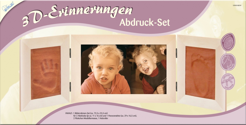 1 Bilderrahmen-Set (ca. 72,5 x 23,5 cm) für 2 Abdrücke (je ca. 11 x 16 cm) und 1 Panorama-Foto (ca. 29 x 16,5 cm), 2 Päckchen Modelliermasse, 1 Holzroller