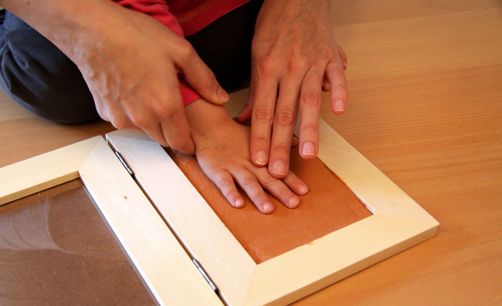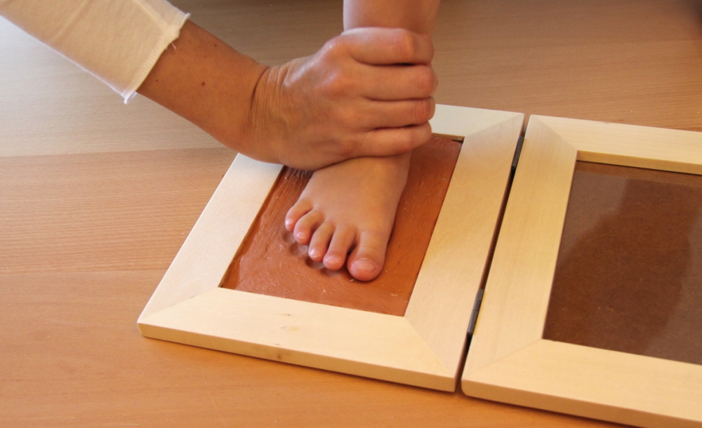 In diesem Set können 2 Abdrücke und 1 Panoramafoto oder eine Collage miteinander kombiniert werden. Die Abdrücke werden auf der ausgerollten lufttrocknenden Knetmasse erstellt und links und rechts im Rahmen platziert. Im Mittelteil wird das Foto oder die Collage hinzugefügt.