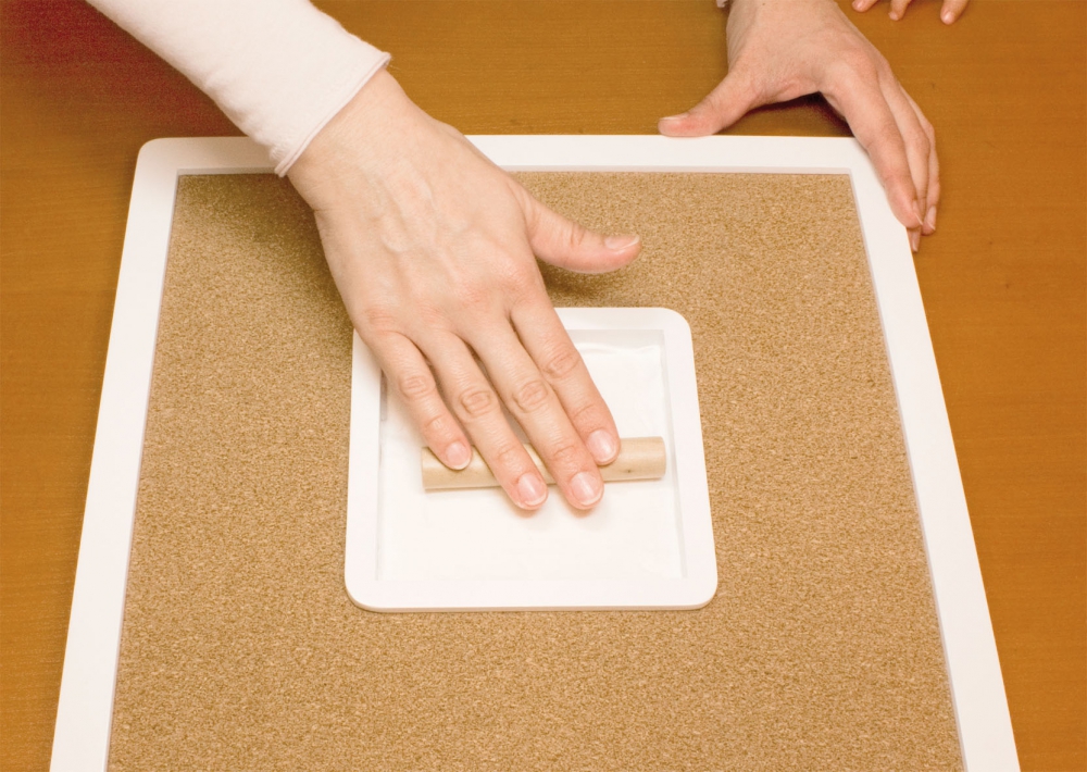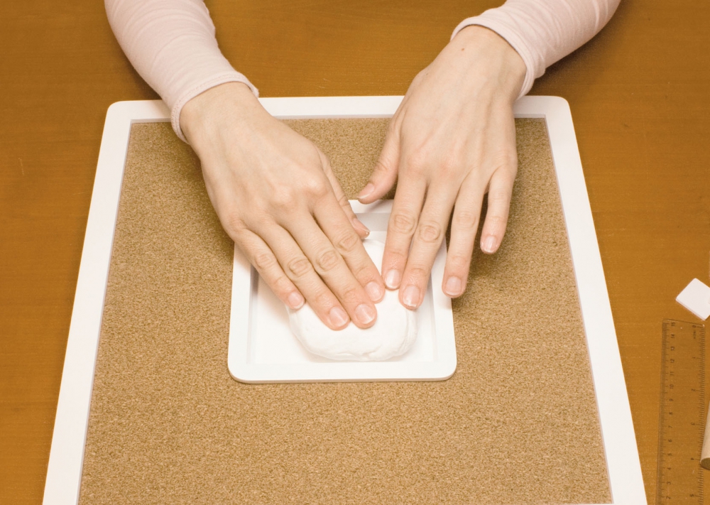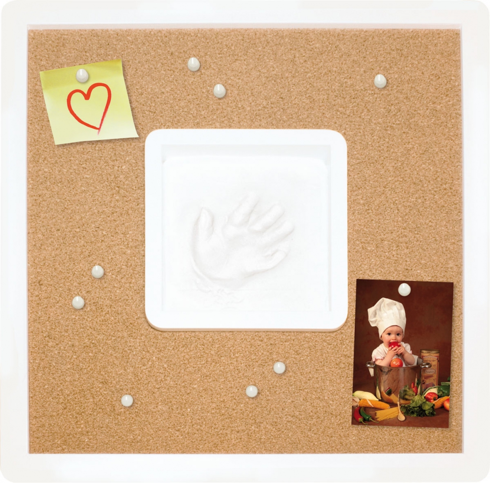 Inhalt: 1 Rahmen mit Korkrückwand (ca. 36 x 36 cm) für 1 Abdruck (ca. 12,2 x 12,2 cm), 1 Päckchen Ultra-leichte Modelliermasse, 10 Pins und 1 Holzroller