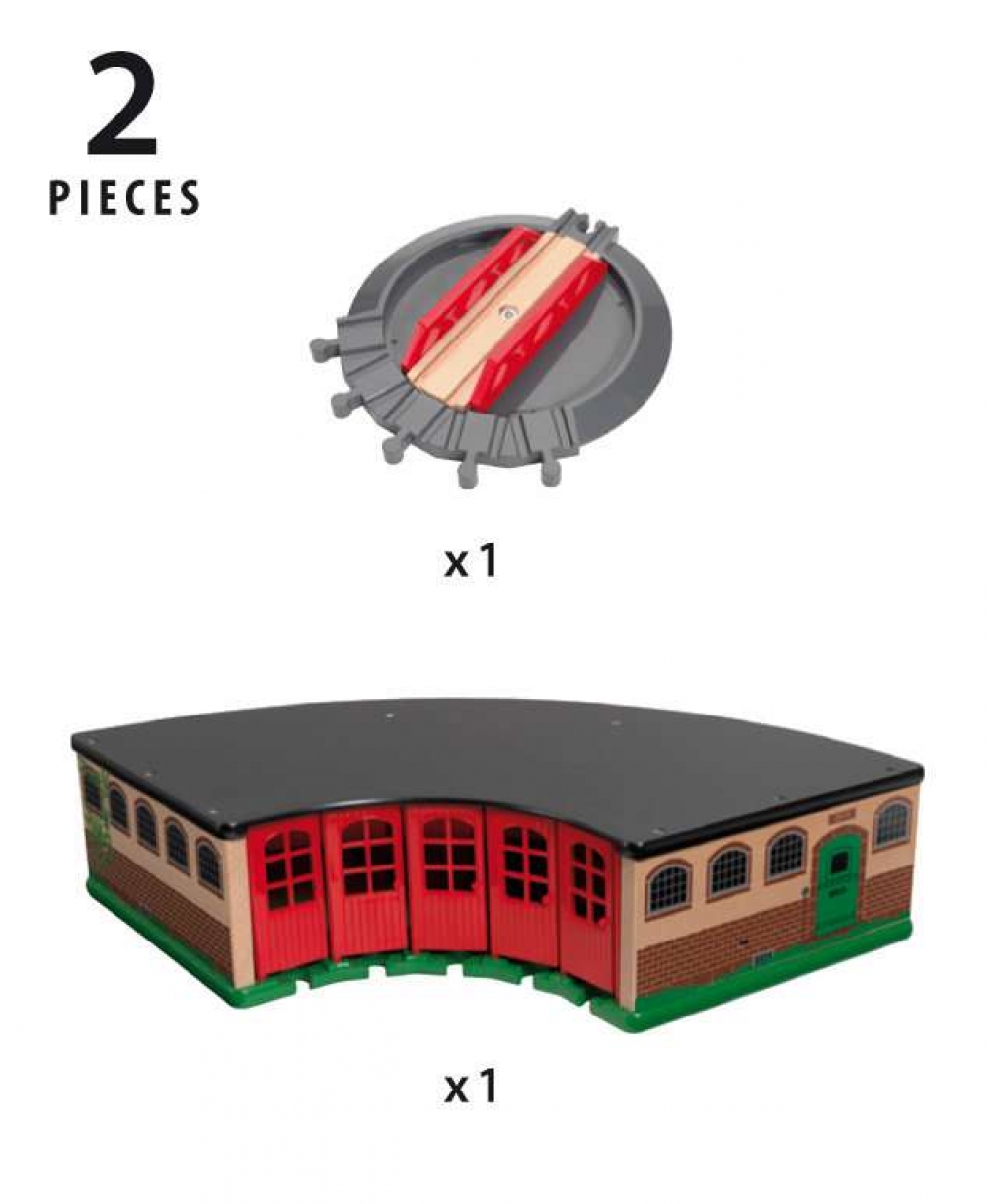 Wo werden die Züge abgestellt? Im großen Ringlokschuppen natürlich! Nimm die Drehscheibe, um die Züge gleich auf ihre individuellen Plätze zu stellen. Die hinteren Türen können geöffnet werden, was das Durchfahren von der Rückseite ebenso ermöglicht.