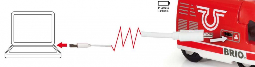 Akku-Zug in modernem Design, der mit dem enthaltenen USB-Miniladekabel aufgeladen werden kann. Eine Schaffnerfigur im passenden Outfit vervollständigt das Bild.