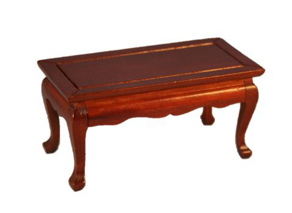Der Couchtisch aus, auf Mahagoni gebeiztem, Holz hat die Abmessung von ca. 100 x 45 x 45 mm (LxBxH)