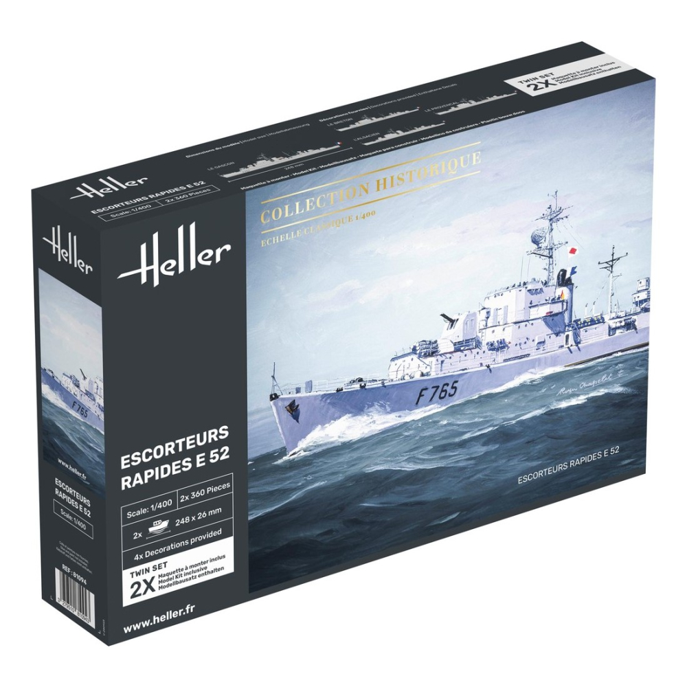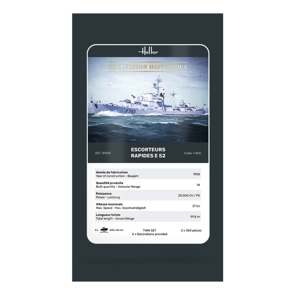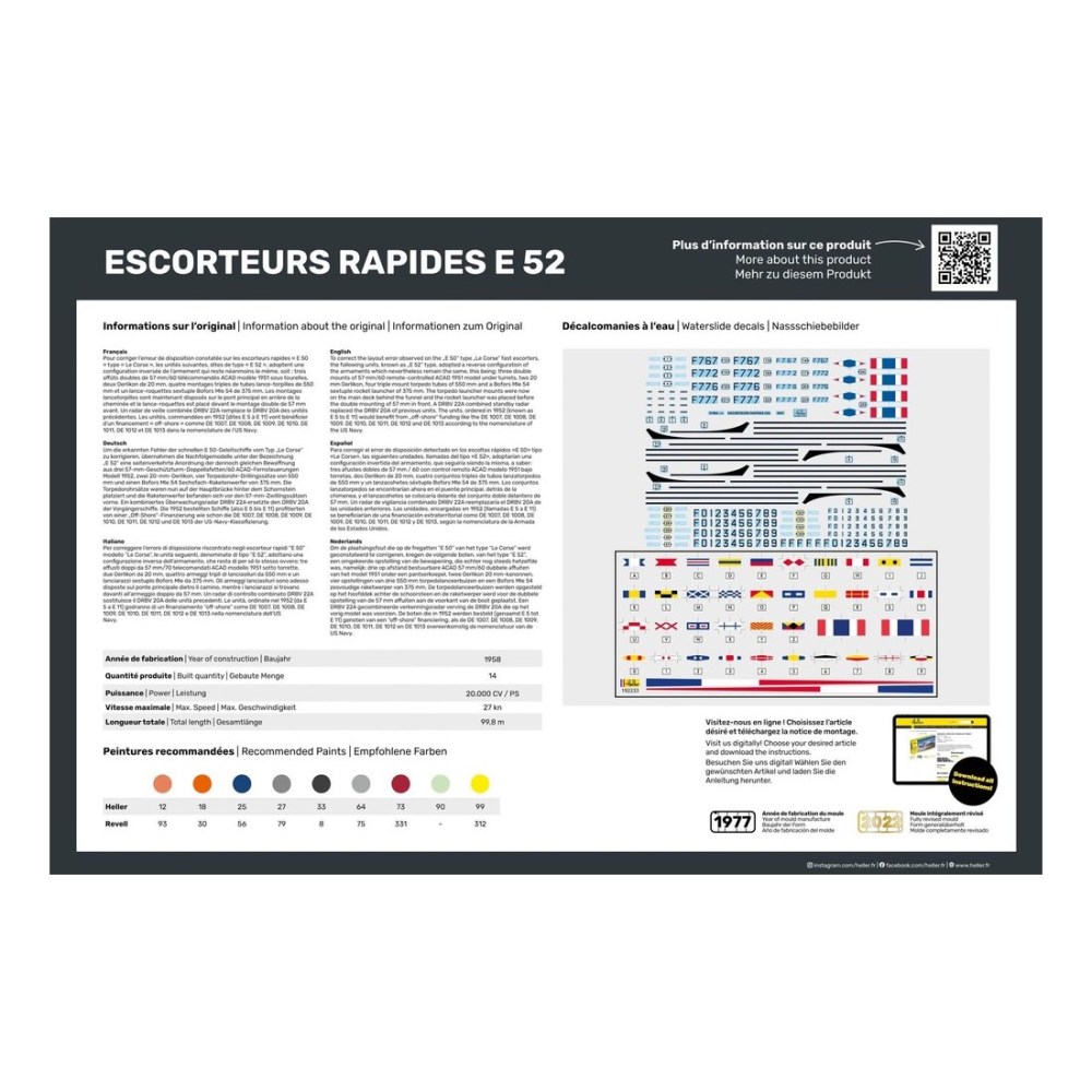 Um die erkannten Fehler der schnellen E 50-Geleitschiffe vom Typ „Le Corse“ zu korrigieren, übernahmen die Nachfolgemodelle unter der Bezeichnung „E 52“ eine seitenverkehrte Anordnung der dennoch gleichen Bewaffnung aus drei 57-mm-Geschützturm-Doppellafetten/60 ACAD-Fernsteuerungen Modell 1952, zwei 20-mm-Oerlikon, vier Torpedorohr-Drillingssätze von 550 mm und einen Bofors Mle 54 Sechsfach-Raketenwerfer von 375 mm. Die Torpedorohrsätze waren nun auf der Hauptbrücke hinter dem Schornstein platziert und die Raketenwerfer befanden sich vor den 57-mm-Zwillingssätzen vorne. Ein kombiniertes Überwachungsradar DRBV 22A ersetzte den DRBV 20A der Vorgängerschiffe. Die 1952 bestellten Schiffe (also E 5 bis E 11) profitierten von einer „Off-Shore“-Finanzierung wie schon die DE 1007, DE 1008, DE 1009, DE 1010, DE 1011, DE 1012 und DE 1013 der US-Navy-Klassifizierung.