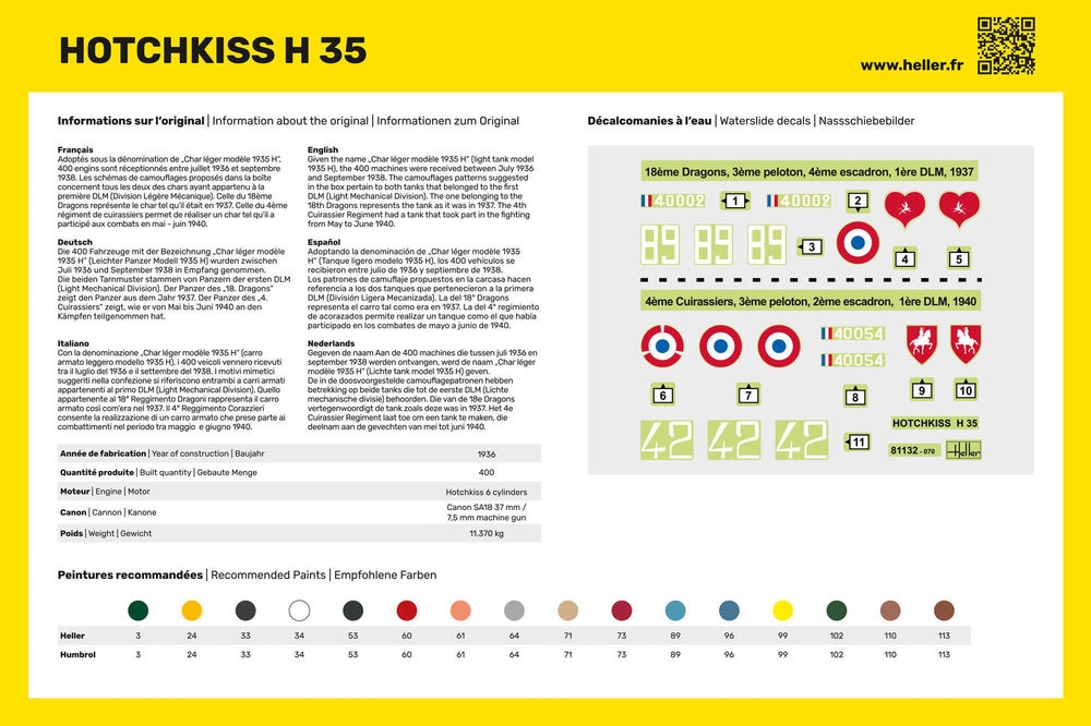 Die 400 Fahrzeuge mit der Bezeichnung „Char léger modèle 1935 H“ (Leichter Panzer Modell 1935 H) wurden zwischen Juli 1936 und September 1938 in Empfang genommen. Die beiden Tarnmuster stammen von Panzern der ersten DLM (Light Mechanical Division). Der Panzer des „18. Dragons“ zeigt den Panzer aus dem Jahr 1937. Der Panzer des „4. Cuirassiers“ zeigt, wie er von Mai bis Juni 1940 an den Kämpfen teilgenommen hat.