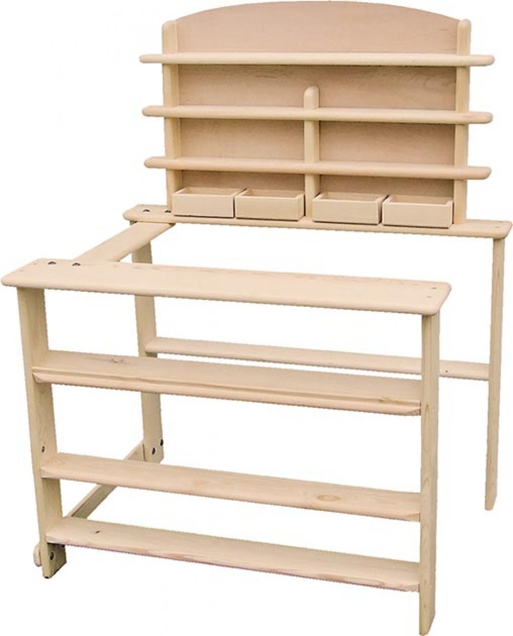 Dieser tolle Holz Kaufmannsladen hat eine Höhe von ca. 104cm, der Tresen vorne ein Höhe von ca. 60cm. Die Lieferung erfolgt ohne die Dekoartikel (Obst, Gemüsekisten und Waage).
