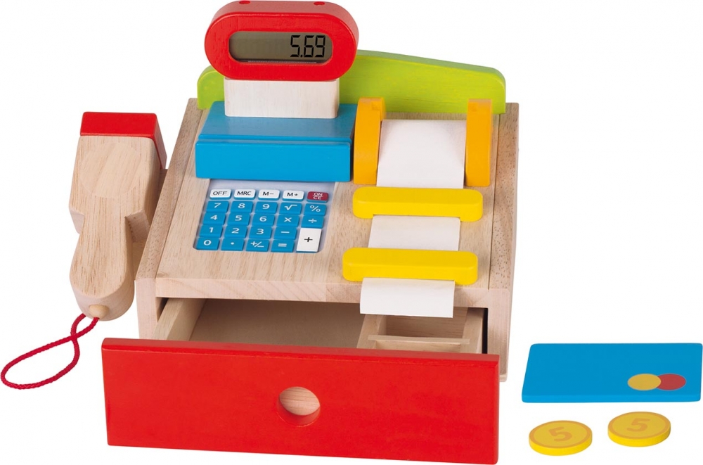 Eine voll funktionstüchtige Kasse mit Scanner, Taschenrechnerfunktion, Kreditkarte, Papierkassenrolle und echtem Display.