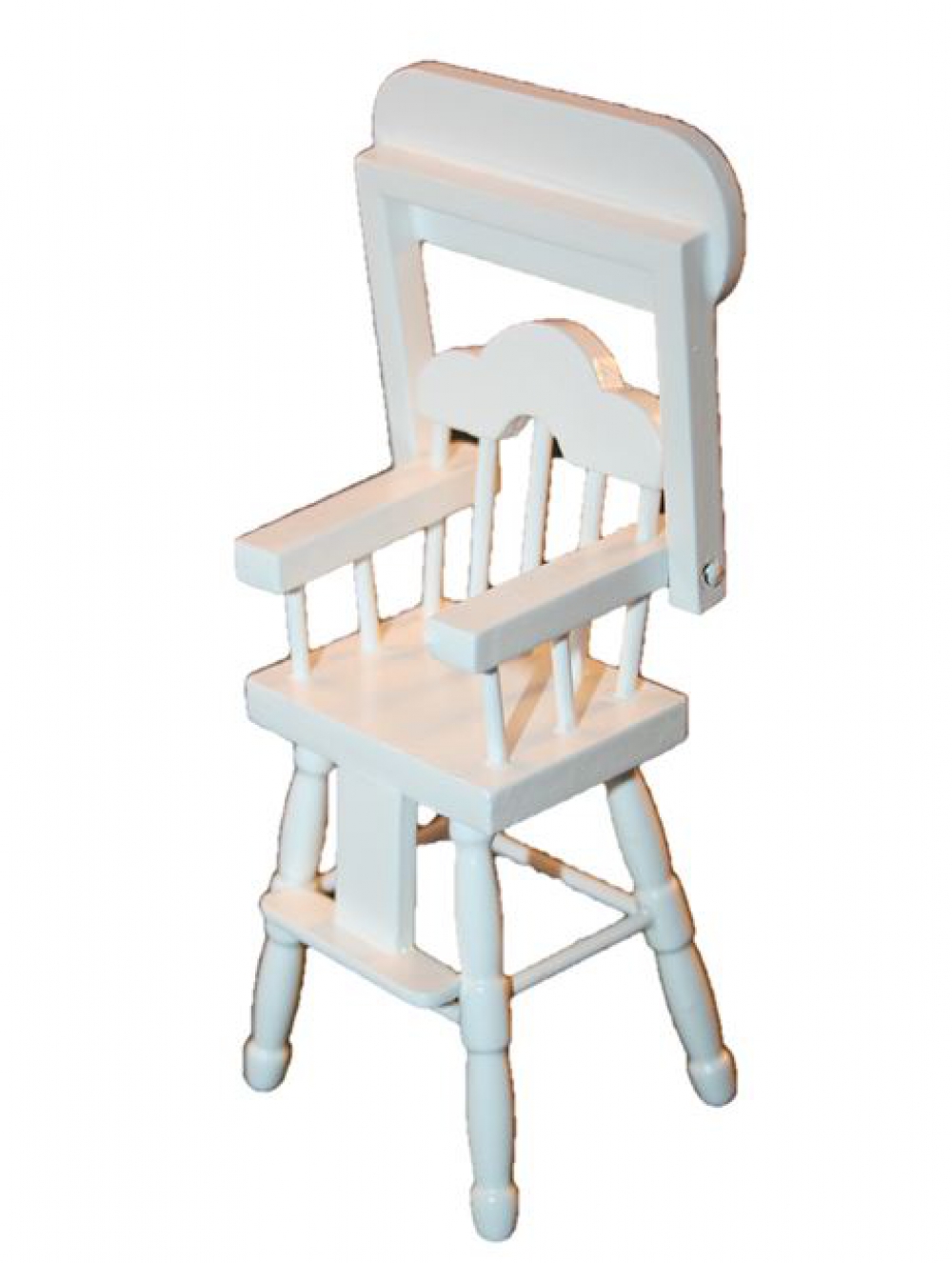 Der weiß lackierte Kinderhochstuhl hat die Abmessung ca. 55 x 50 x 98 mm (LxBxH)