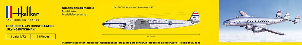 1947 bekam K.L.M. als erste europäische Fluggesellschaft, die Lockheed L-49 Constellation. Kurz darauf wurde die L-749 eingeführt. K.L.M. hatte insgesamt 26 Lockheed L-49 / L-749 Flugzeuge betrieben. Sie flogen hauptsächlich Langstrecken nach Nordamerika, in die Karibik, in den Fernen Osten und nach Australien! 1950 wurden die 1947/48 ausgelieferten L-749 in L-749A-Flugzeuge umgebaut, mit einer anderen Abgasanlage und einem anderen Fahrwerk. Aufgrund der anderen Abgasanlage wurde die Geschwindigkeit leicht erhöht, nämlich um 8-16 km/h. Nach der Einführung der DC8 im Jahr 1960 wurden die 10 verbliebenen Constellationen außer Dienst gestellt. Fünf von ihnen wurden 1962/63 zur Verschrottung verkauft und der Rest an neue Eigentümer übergeben. Die PH-TDK „Amsterdam“ wurde am 9. November 1948 am K.L.M. geliefert. Am 3. März 1954 wurde sie erneut als PH LDK registriert. Am 8. November 1958 wurde die „Amsterdam“ außer Dienst gestellt und wurde schließlich am 25. Juni 1963 verschrottet.