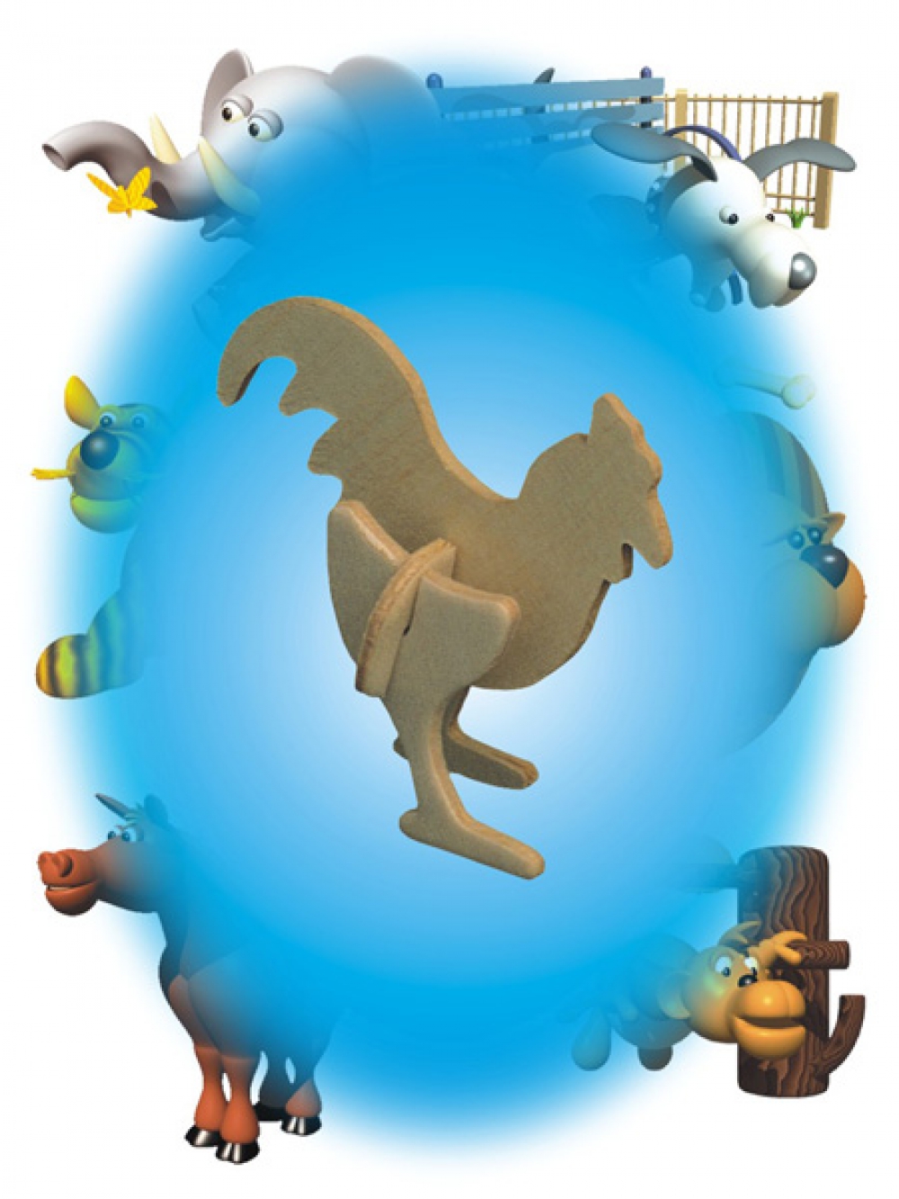 Die Einzelteile werden vorsichtig aus der vorgestanzten Platte herausgelöst. Zusammengesetzt ergibt sich eine nette Figur. Die Holplatte hat folgende Maße L x B x H ca. 72 mm x 117 mm x 3 mm