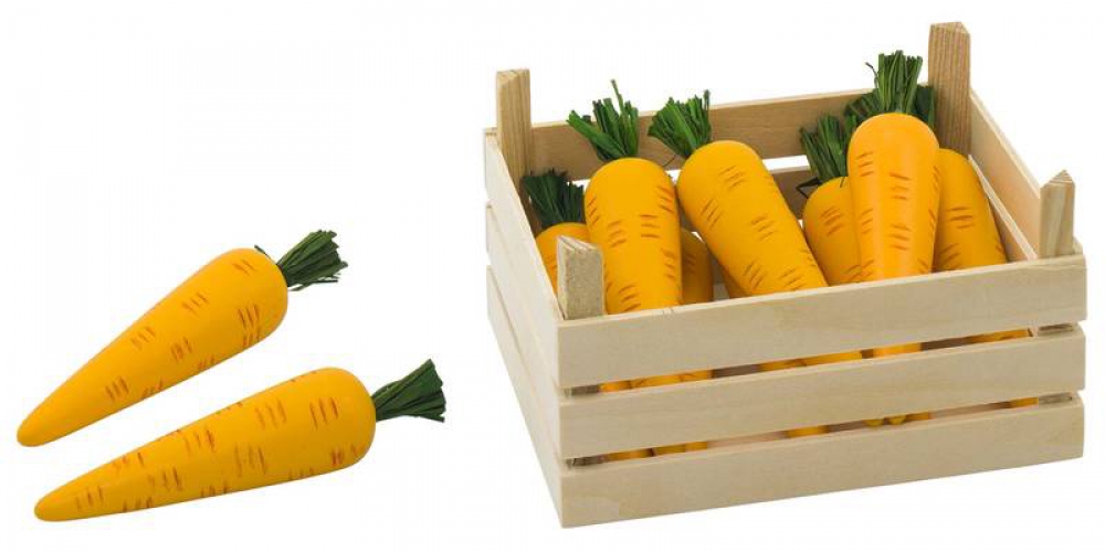 Die 10 Möhren aus Holz haben eine Höhe von ca. 11 cm und werden in einer Holzkiste geliefert.