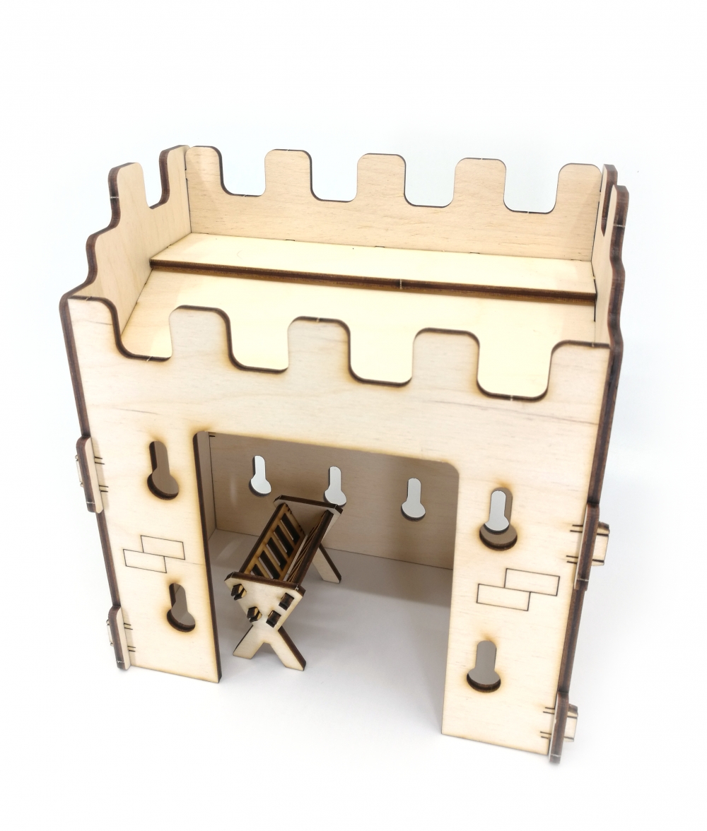 Der Bausatz besteht aus 16 Teilen und kann im Allgemeinen von einem 10 Jahre alten Kind alleine montiert werden. Fertig moniert hat man einen Stall und zwei Futterkrippen.