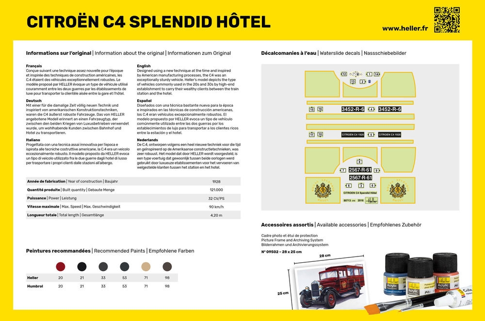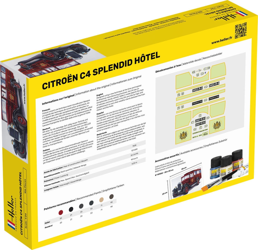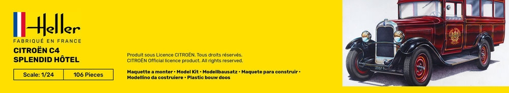 Mit einer für die damalige Zeit völlig neuen Technik und inspiriert von amerikanischen Konstruktionstechniken, waren die C4 äußerst robuste Fahrzeuge. Das von HELLER angebotene Modell erinnert an einen Fahrzeugtyp, der zwischen den beiden Kriegen von Luxusbetrieben verwendet wurde, um wohlhabende Kunden zwischen Bahnhof und Hotel zu transportieren.