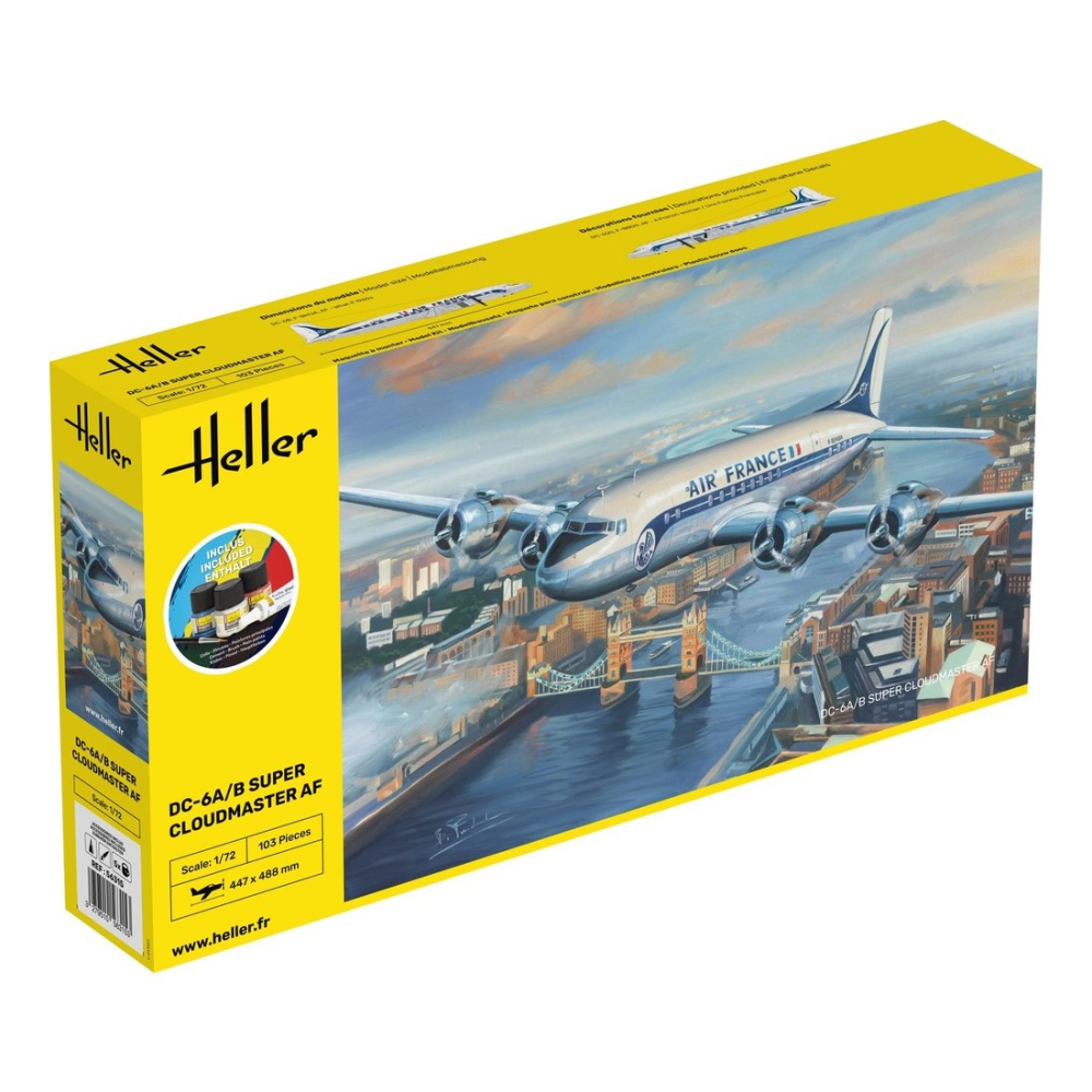 Die Entwicklung der DC-6 begann während des 2.Weltkriegs, um den Bedarf der US Air Force an militärischen Langstreckenfrachtflugzeugen zu decken. Unmittelbar nach dem Krieg wurde sie für die zivile Nutzung umgerüstet und mit einer Druckkabine und der Möglichkeit 52 bis 68 Passagiere zu befördern, ausgerüstet. Die erste Luftfahrtgesellschaft, an die die DC 6 im April 1947 ausgeliefert wurde, war die UNITED AIR LINES. Bis 1958 wurden 286 DC-6B gebaut, bis die Produktion 1958 eingestellt wurde. Die hier gezeigte Heller Variante ist eine DC-6B „What if“-Version, wie Sie bei Air France hätte aussehen können.
