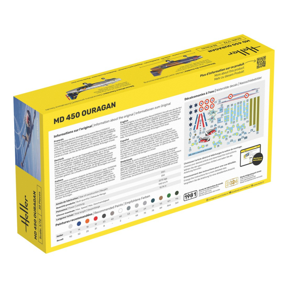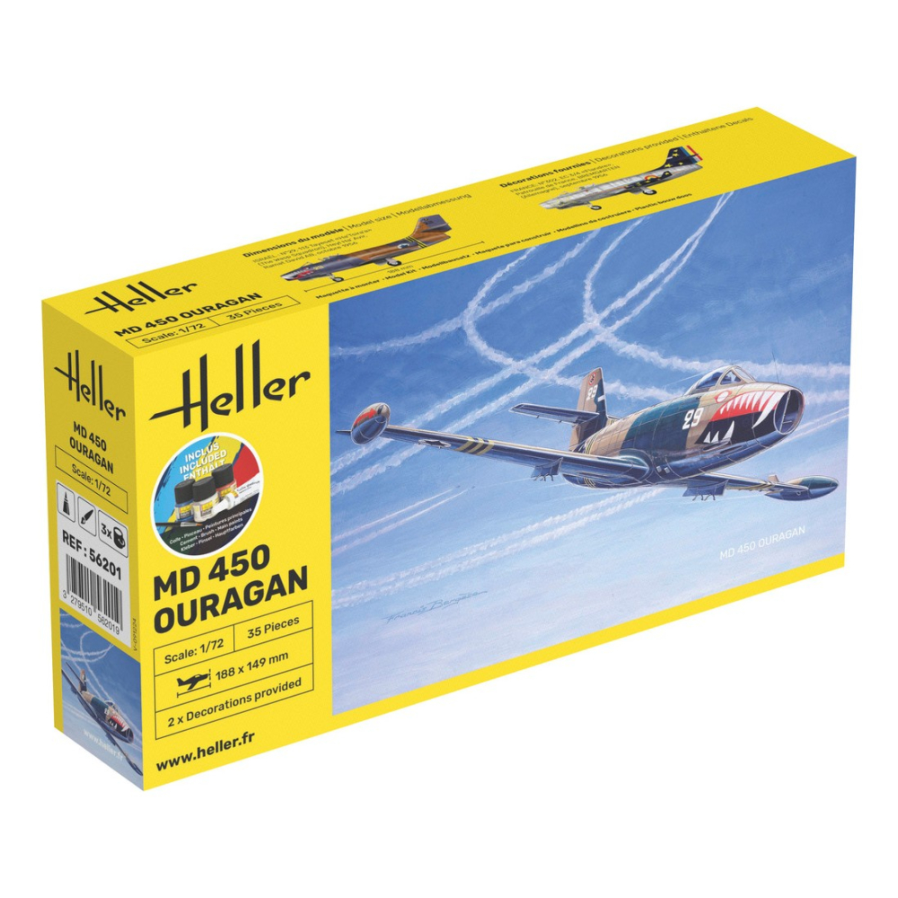 Der erste Düsenjäger, der von der Flugzeugfi rma Marcel DASSAULT entworfen wurde, war zugleich der erste französische Düsenjäger, der in Serie produziert wurde. Die Konzeption und das Design des MD450 verdanken wir den Ingenieuren DEPLANT, CABRIERE und ROUAULT. Der Prototyp absolvierte seinen Jungfernfl ug am 23. Februar 1949. Das erste Serienmodell hob am 5. Dezember 1951 ab. Insgesamt wurden 350 Ouragans gebaut, wobei die französische Luftwaffe 175 Maschinen behielt, die übrigen wurden nach Israel und Indien geliefert. Die Luftwaffe El Salvadors kaufte 18 Ouragans aus Israel.