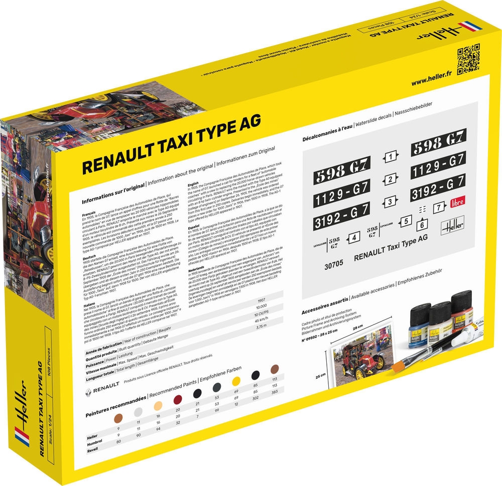 1905 startete die Compagnie Française des Automobiles de Place, die den Namen G7 erhielt, eine Ausschreibung für eine Flotte von „Reisebussen“, um die 20.000 in Paris bewegenden Pferdefahrzeuge zu ersetzen. RENAULT gewinnt den Markt mit der Type AG, der mit einem 8-PS-Zweizylindermotor ausgestattet ist. Das Fahrzeug wurde am 26. September 1905 der „École des mines“ (Hochschule für Ingenieure) übergeben und ab diesem ersten Jahr in 250 Exemplaren bestellt. Die Auslieferung beginnt sofort, und die G7 gibt 1906 eine neue Bestellung für 1000 „Taxis“ auf, dann 1908 für 1500. Der von HELLER angebotene Typ AG-1 erschien 1907.