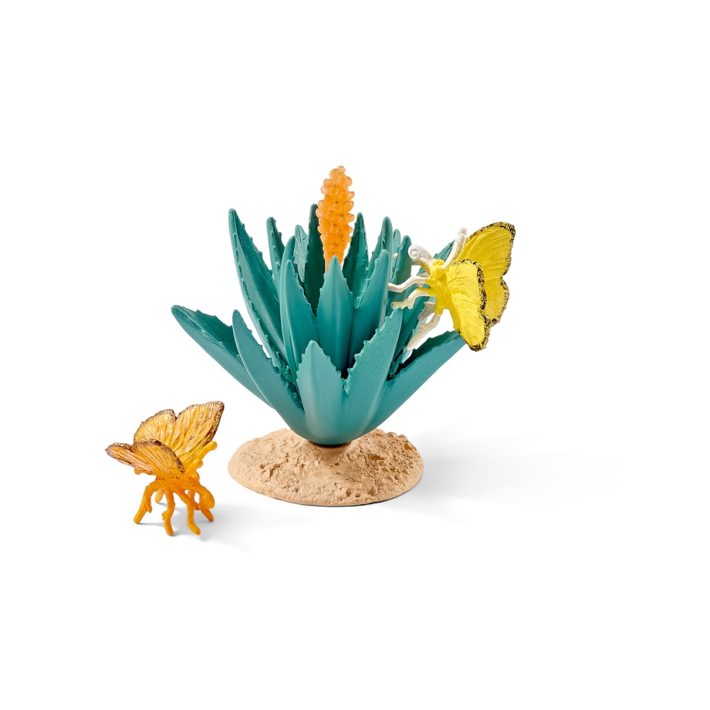 In tropischen Gebieten leben riesige, bunte Schmetterlinge. Zwei dieser wundervollen Tiere sind auf einer blühenden Agave gelandet und suchen dort nach Nektar. Pflanzenteile sind zusammensteckbar!