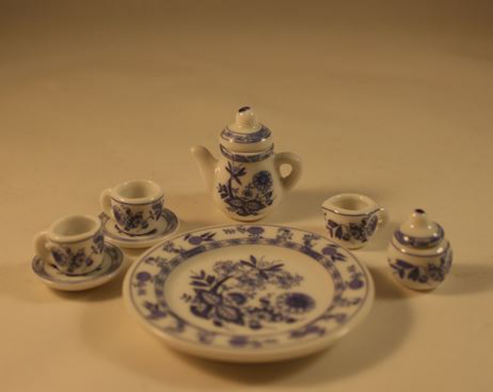 Das aus Porzellan gefertigte Teeservice hat ein Zwiebelblau Muster