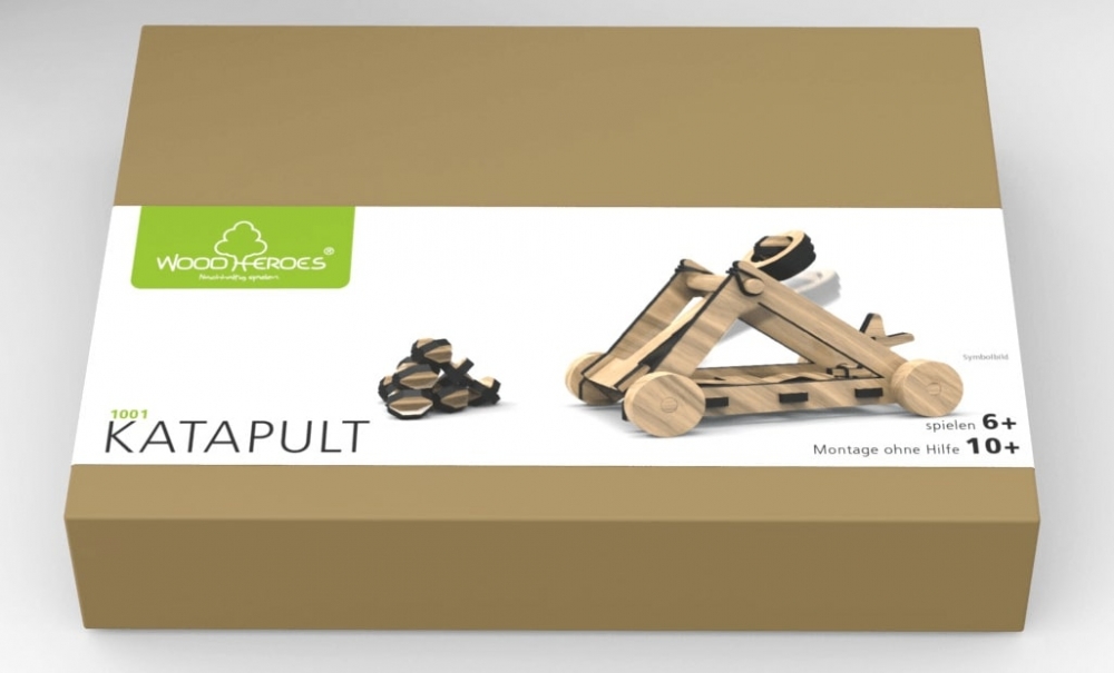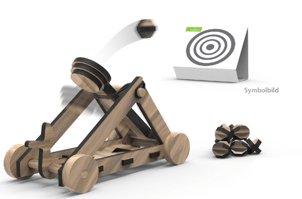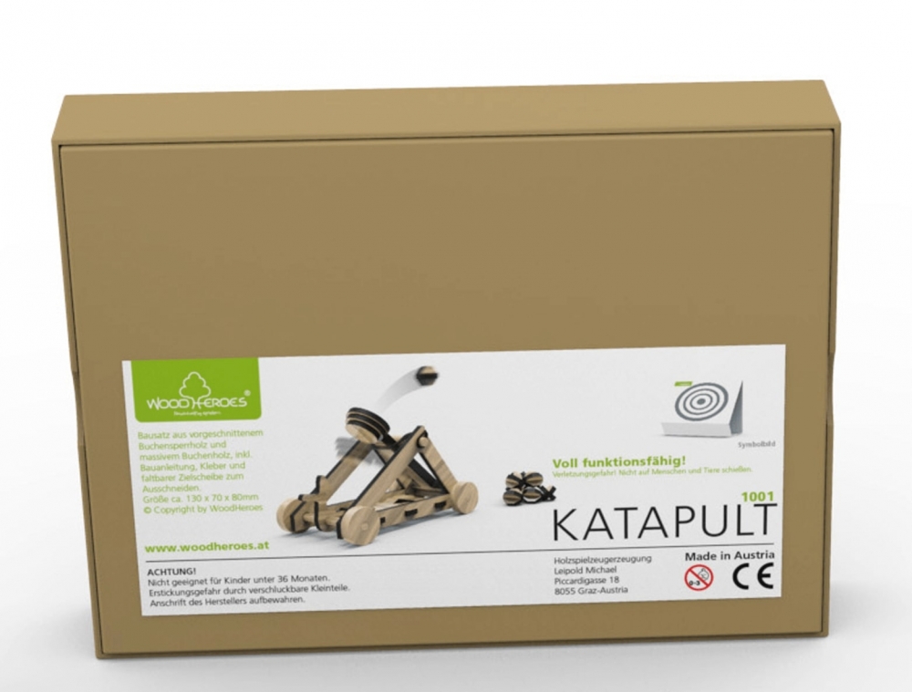 Voll funktionsfähiger Bausatz aus Buchensperrholz, 4 mm dick, mit dem Laser vorgeschnitten, und Drechselteilen aus Buche massiv. Inklusive Schmirgelpapier, Zielscheiben, Gummiringe, Leim und Bauanleitung in einer Kartonverpackung. Der Bausatz hat 40 Teile und kann von einem 10 Jahre alten Kind alleine montiert werden Enthält auch 10 Stück Munition. Bauanleitung: https://www.woodheroes.at/de/1001.pdf Spielen: 6+ Montage ohne Hilfe: 10+ Kartongröße: ca. 230 x 165 x 48 mm (L x B x H) Montiertes Katapult: ca. 125 x 67 x 75 mm (L x B x H)
